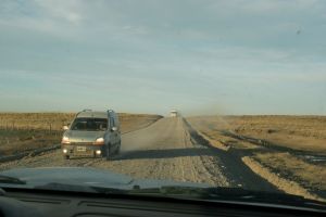 Weiter ging es durch die Pampa del las Tres Hermanas und die Pampa del Setenta. Bei Comodoro Rivadavia verließen wir die Ostküste am Atlantik und fuhren Landeinwärts bis Sarmiento, wo sich die Landschaft plötzlich in eine grüne Oase verwandelte. Hier gibt es reichlich Wasser, was wir abends dann auch durch Massen von Mücken zu spüren bekamen. Der Dunstschleier auf dem rechten Bild ist nicht etwa Nebel, sondern eine der üblichen Pisten, auf denen die Autos viel Staub aufwirbeln. |